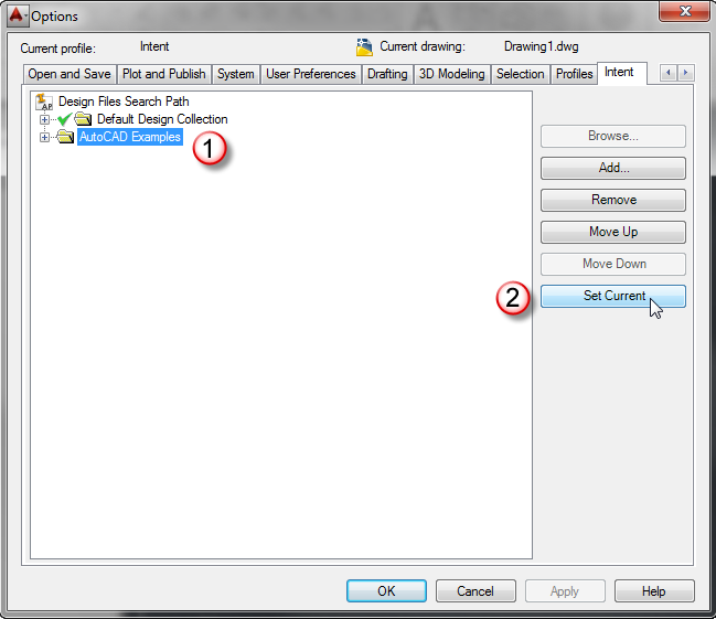 - In the Options dialog box, Intent tab, select the collection to set current.