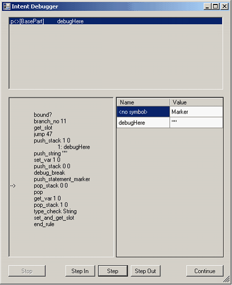 The Intent Debugger is not a “source” debugger. The instructions do not map to source lines such as instructions that allocate, initialize, and deallocate local variables, perform type-checking, and get and set Rule values. There are also instructions that are included because of the presence of certain flags, such as Parameter and Lookup. There is no intent to document fully the compiled version of the language.