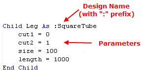 Child <name> As <DesignNameExpression> [, <Quantity = Expression>] <ParameterAssignmentList> End Child