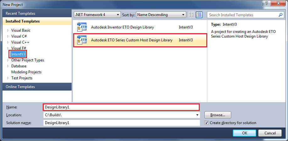 To get started, Launch Visual Studio and select File->New->Project from the menu. The New Project dialog is displayed and you should see an IntentV3 Section as shown below. Select the "Autodesk ETO Series Custom Host Design Library" template and give the project a name.