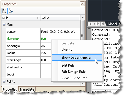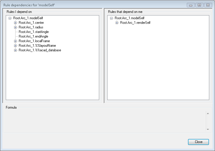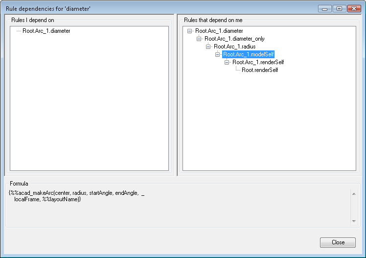 In Formula, the formula for the selected node in the tree displays. In this case, "diameter" is a simple numeric parameter, and it depends on no other rules. The selected modelSelf rule depends on diameter, but indirectly. The rule is an internal function call that references Radius, not Diameter. But the Group rule diameter_only is triggered to obtain the Radius for the Arc.