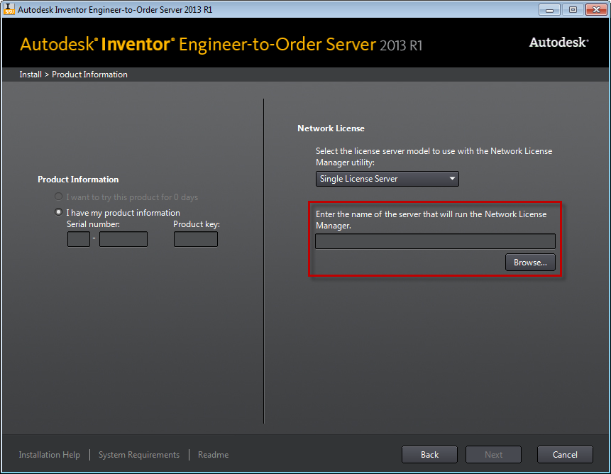 - On the Product Information page, enter the license information. Enter the name of the server that you select in Network License.