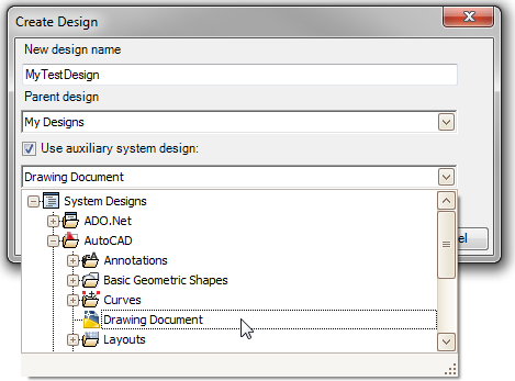 Select the check box for Use Auxiliary System Design, and select Drawing Document to mix in the AcDrawingDocument design.