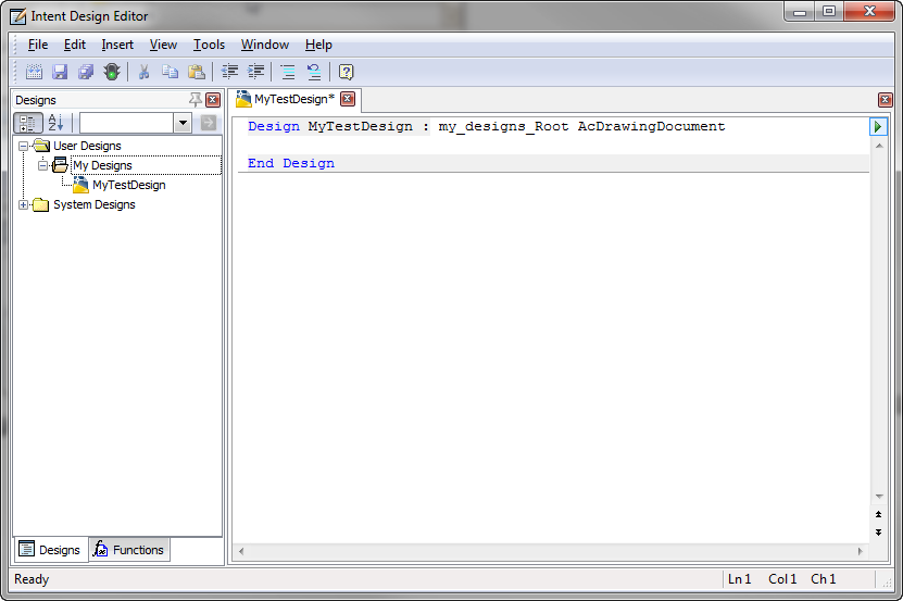 In Intent Design Editor, the new design displays in the Designs pane, and the Design Editor source code window.
