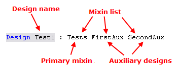 A design can inherit rules from another design, or from multiple designs (multiple inheritance).The first design from which a design inherits is referred to as the primary mixin. Subsequent, inherited designs are known as auxiliary designs.