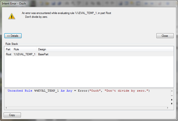 Raises an error, using the given string as the error message. The error, like all built-in language errors, is always fatal to the current computation. The actual effect of the error depends on the environment in which the rules are running. In Inventor, you will see a "normal" error handler window, like the one shown in the examples. In custom user-interfaces, it is up to the UI to display the error in an application-specific fashion.