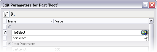 When you specify a SelectFile editor, a Browse icon appears in the related Value field in the Part Editor.
