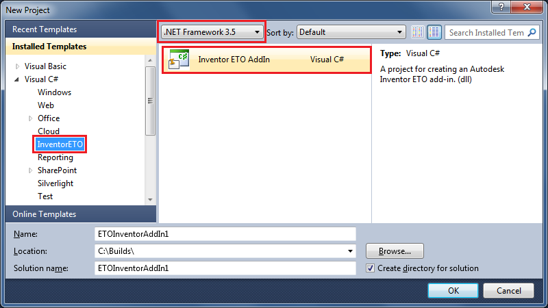 Note: Autodesk Inventor 2012 supports add-ins targeting .NET Framework 3.5 (not 4.0) so you must select 3.5 as the target before the template will show up.