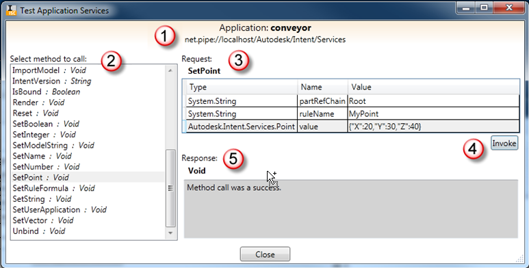 To display the Test Application Services dialogbox, click Test Application Services. Test your application using the methods available in the WCF service on the server. See IIntentServices in the API help for a description of the service. The server exposes this service so that your web (or other remote application) can communicate with Intent running on the server.