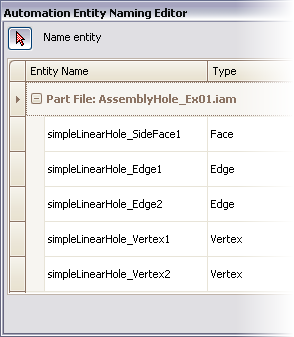 There is an automatic entity naming mechanism for IvAssemblyHoleFeature. The illustration shows the automatically-applied entity names as viewed in the Entity Naming Editor.