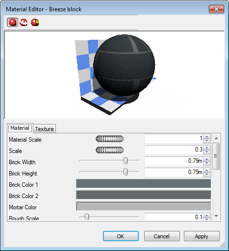 To edit a material, double-click it in the palette, or right-click it and click Edit on the context menu. The Material Editor dialog box opens, which will vary for different types of material. You can’t add or remove parameters on a material. You can merely edit those existing. So it is important to use the right type of material template for the material you want to edit. The dialog box for the Breeze Block procedural texture is shown below and this will be used as an example of how to edit a material.