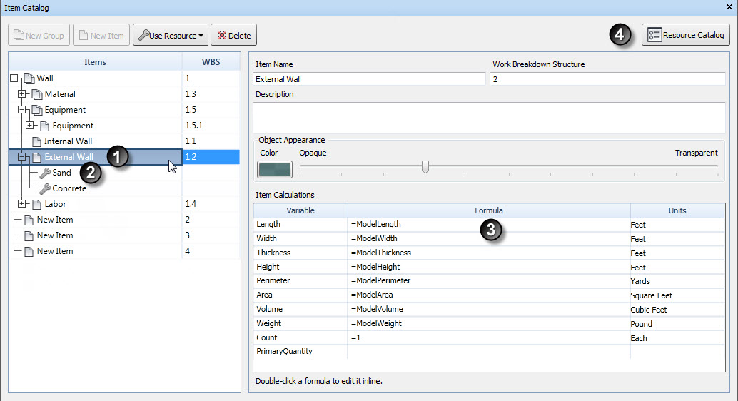 The Item Catalog is the organizational database for your takeoff. The Item Catalog and Resource Catalog share the same structure, a selection tree, variables pane, and general information. Items in the Item Catalog can be directly associated with a model object, such as a wall or window. Items can exist alone or can contain resources.