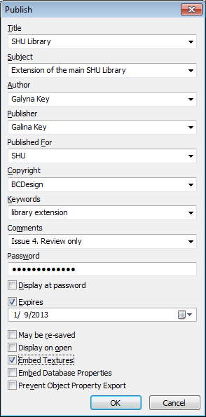Use the Publish dialog box to enter the document information, and specify the required document protection. The text boxes in this dialog box remember history of up to five last entries. Clicking the down arrow on the far right side of the text box lets you select an entry instead of re-typing it.