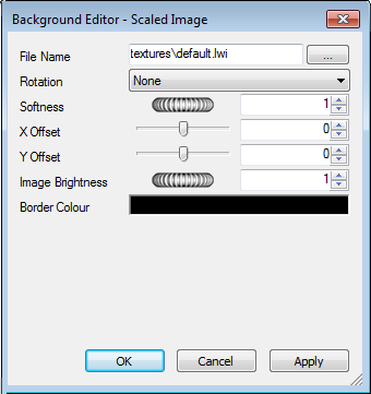 Double-click an effect in the palette to open the Background Editor. Each editor will be different for each type of background. The Scaled Image editor is shown here: