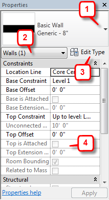 In most cases (see exceptions in note below), the Properties palette displays both user-editable and read-only (shaded) instance properties. A property may be read-only because its value is calculated or assigned automatically by the software, or because it depends on the setting of another property. For example, a wall’s Unconnected Height property is only editable if the value of its Top Constraint property is Unconnected. For specific dependencies, see the instance property descriptions for individual element types, such as Wall Instance Properties.