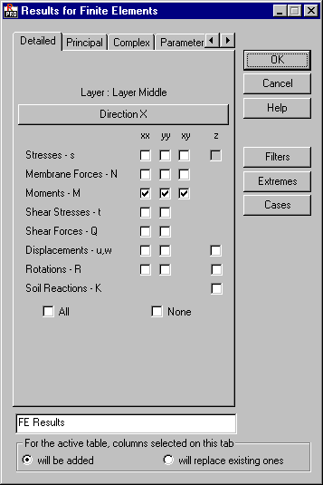 The Layer option on the Parameters tab also has a strong influence on the values presented in the table. It allows for the selection of a layer parallel to the middle surface of the surface structure for which calculation results will be presented. The selection of the layer has no effect on shear forces or displacements. These are selected for the middle surface and are constant along the whole height of the FE cross-section. This selection is important during stress presentation.