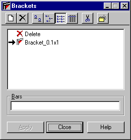 The Brackets dialog lets you directly assign bracket properties to structure elements. It has an active list field, active selection field, and the standard buttons (Apply, Close, and Help). Information about the label and the type of the defined bracket is in the active list field.