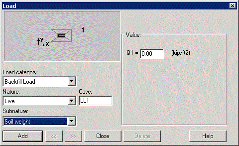 In the case of a backfill load, the value of the load Q1 should be entered. Two natures are available: dead and live.