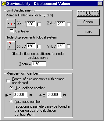 Click Service in the Member Definition - Parameters dialog to define additional code parameters determining displacement values (limit displacements) for timber members.