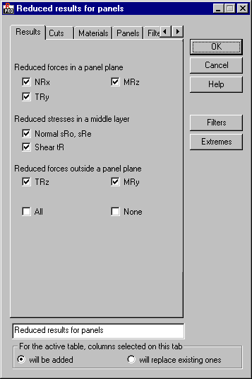 Select the Results tab in the Columns dialog to select quantities for presentation.