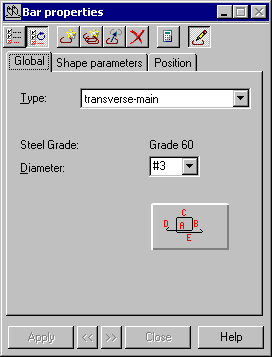 The Global tab presents basic data concerning a selected reinforcing bar, namely: steel type, code symbol, steel grade, reinforcing bar diameter and shape. The Shape parameters tab contains bar-shape symbol and bar component lengths. The Position tab contains the coordinates of the beginning of the reinforcing bar (this tab allows changing the reference point of coordinates).