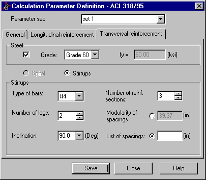 The Transversal reinforcement tab from the Definition of calculation parameters dialog for ACI 318/95 code or ACI 318/95 metric code: