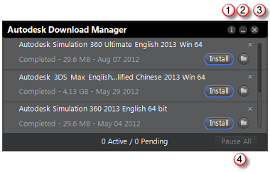 This topic explains the specific controls available in the Autodesk Download Manager window.