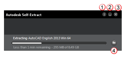 To extract your files, double-click the .EXE file after all parts of the download have completed. If your Autodesk product is larger than 4 GB, and packaged in multiple .EXE files, you can click any one of the parts to start the extraction. All parts will be extracted in a single operation. Self-Extract asks you to confirm the destination folder for the extracted files, and allows you to change it. While files are being extracted, you can use the controls shown in the figure.