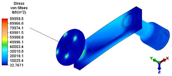 Click Results Contours Stress von Mises. The model displays as shown in the following image. The exaggerated stresses at the beam element attachment points may be ignored.