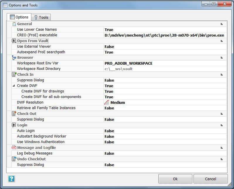 Pro/ENGINEER Options are set in the Options and Tools dialog box.