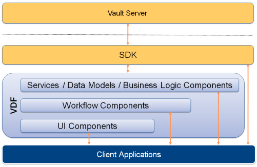 The diagram below shows how the VDF relates to the Vault Server and your client applications.