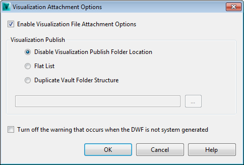 Enable or disable file attachments, specify where visualization attachments are published, and disable or enable the DWF warnings on the Visualization Attachment Options dialog.