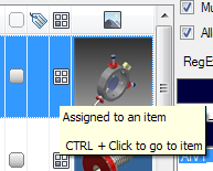 Columns in the grid can be customized to turn their cells into "hot cells." These cells can have a custom tooltip. A custom action can be performed when the user CTRL-clicks on the tooltip. As shown in the following image, files that are assigned to an item can use the hot cell mechanism to link to that item. ![]() |
