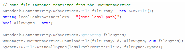 For developers who are most interested in performing a direct port from the 2013 SDK to the 2014 SDK, they will likely focus on using the non-GUI, synchronous download method, FileManager.AcquireFiles(). This is because the previous versions of SDK didn't provide any GUI or asynchronous components or methods and so it is likely that the client applications to be updated will already have some sort of existing GUI or code to which files to download and/or checkout. Most 2013 applications probably downloaded files from the Vault using the DocumentService's DownloadFile() method. This method simply pulls down the bytes for a given file in Vault. Some code using it might look something like this:
