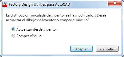 El siguiente cuadro de diálogo aparece al abrir un dibujo 2D de AutoCAD del que se ha revisado el layout de Inventor Factory vinculado. Haga clic en Aceptar para actualizar el dibujo con los cambios del layout 3D.