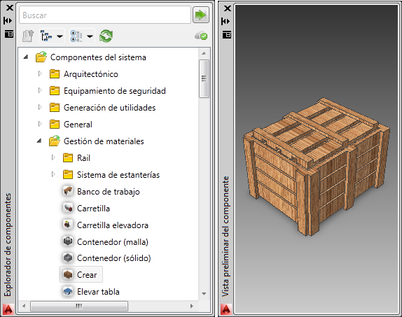 Las distribuciones 2D de Factory se pueden rellenar con componentes de la fábrica asociativos. Existen componentes del sistema, que son los que se suministran con Factory Design Suite; componentes de usuario, los que crea el usuario; y componentes basados en nube, que son aquellos componentes de la fábrica existentes en un servidor de nube que se pueden descargar y utilizar.