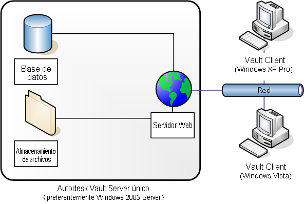 En un entorno compartido, Autodesk Vault Basic consta de dos componentes: Vault Server y Vault Client. El servidor almacena los archivos de datos principales con toda la información del diseño. Los clientes permiten acceder a los archivos almacenados en el servidor.