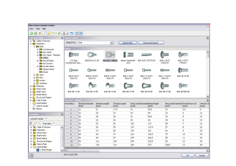El cuadro de diálogo Insertar desde el Centro de contenido es la interfaz principal para el usuario del Centro de contenido. Puede encontrar, seleccionar e insertar una pieza o una operación normalizada en un ensamblaje. El cuadro de diálogo presenta una vista fusionada del contenido de todas las bibliotecas configuradas.