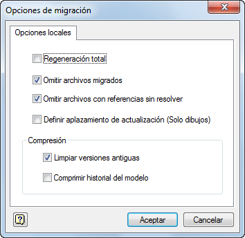 - Comprimir historial del modelo: no seleccione esta opción si va a migrar archivos a una nueva versión porque limpia el historial de recuperaciones empleado para la edición rápida de operaciones. Debe usarse solo si se trabaja con ensamblajes extremadamente grandes y experimenta limitaciones de capacidad.