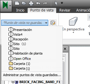 Haga clic en la ficha Punto de vista grupo Guardar, cargar y reproducir menú desplegable Punto de vista actual y elija el punto de vista guardado de la lista.