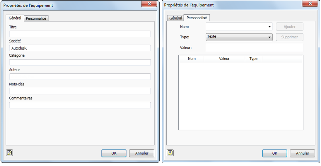 Les propriétés des fichiers Autodesk Inventor sont appelées iPropriétés. Elles permettent d'effectuer le suivi et la gestion des fichiers, d'établir des rapports et de mettre à jour automatiquement les nomenclatures des ensembles, les listes de pièces et les cartouches des dessins, ainsi que d'autres informations. Les équipements d'usine possèdent des propriétés très similaires aux iPropriétés. Ces propriétés peuvent être définies à l'aide des iPropriétés ou à l'aide de l'option Propriétés de l'équipement.
