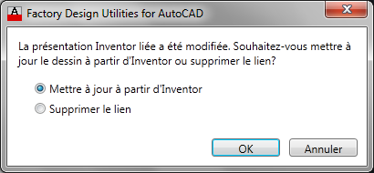 La boîte de dialogue suivante s'affiche lorsque vous ouvrez un dessin 2D AutoCAD dont la présentation Inventor Factory qui lui est associée a été modifiée. Cliquez sur OK pour mettre à jour le dessin en fonction des modifications apportées à la présentation 3D.