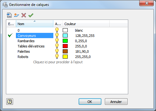 Vous permet de créer, de renommer, d'activer ou de désactiver la visibilité, d'attribuer des couleurs et de supprimer des calques de votre équipement 3D dans la présentation Inventor Factory à l'aide d'une boîte de dialogue. Les calques peuvent également être importés à partir d'un fichier DWG existant.