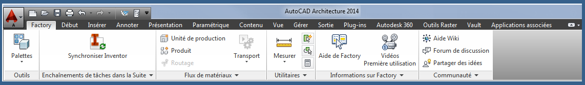 L'interface utilisateur de Factory Design Utilities se trouve dans l'onglet Usine et comprend des groupes de fonctions nommés Outils, Enchaînements de tâches dans la Suite, Flux de matériaux, Utilitaires, En savoir plus sur Factory et Communauté. L'environnement de travail par défaut de Factory est composé d'un mélange des groupes de fonctions standard AutoCAD et de Factory.