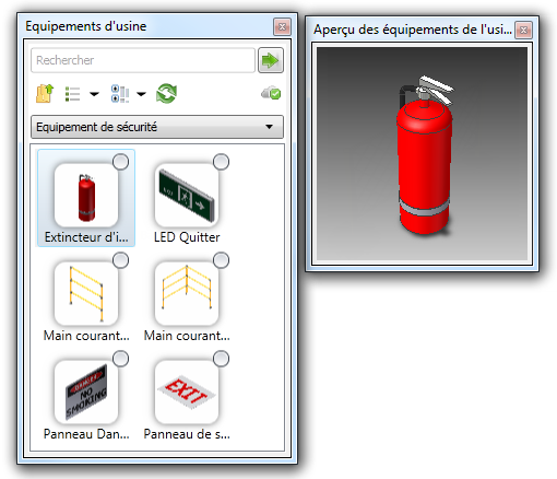 Cliquez avec le bouton droit de la souris sur un équipement du navigateur d'équipements, puis sur Aperçu dans le menu contextuel pour visualiser l'équipement dans une vue 3D élargie. Maintenez le bouton gauche de la souris enfoncé tout en déplaçant la souris pour faire pivoter l'équipement dans la Fenêtre d'aperçu. Vous pouvez également utiliser la molette de la souris pour effectuer un zoom avant ou arrière.