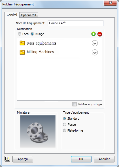 Remarque : La case Publier l'équipement 2D peut également être activée et désactivée dans l'onglet Générateur d'équipement de la boîte de dialogue Options de Factory. Par défaut, cette option est activée.