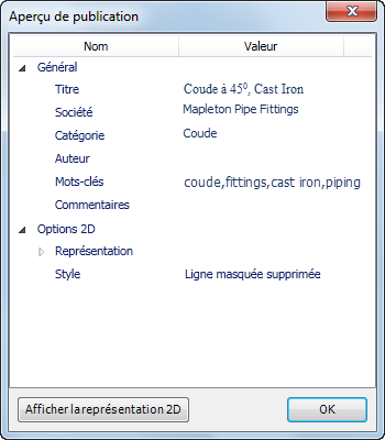 - Cliquez sur le bouton Aperçu pour vérifier les propriétés de l'équipement ou les iPropriétés qui ont été définies pour l'équipement. Si vous souhaitez afficher la version 2D de l'équipement, cliquez sur le bouton Afficher la représentation 2D situé dans la partie inférieure gauche de la boîte de dialogue. Lorsque vous avez terminé la prévisualisation de l'équipement, cliquez sur le bouton OK pour fermer la boîte de dialogue Aperçu de publication.