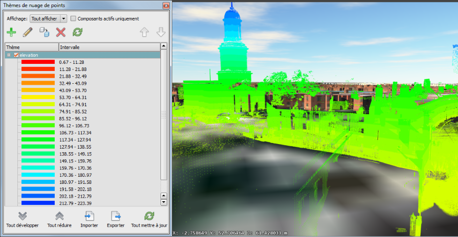 | Elévation | Thèmes en fonction de la hauteur. Les valeurs maximale et minimale sont déterminées automatiquement en fonction des données du nuage de points. Vous pouvez les ajuster si nécessaire. |