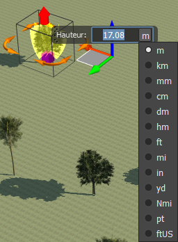 Par exemple, vous pouvez utiliser des gizmos pour déplacer et faire pivoter les objets sélectionnés. Lorsque vous sélectionnez un gizmo, vous pouvez entrer une valeur ou faire glisser le gizmo vers la position souhaitée. Dans la zone dédiée à la valeur, vous pouvez modifier l'unité de mesure en cliquant sur la valeur actuelle et en sélectionnant une autre.