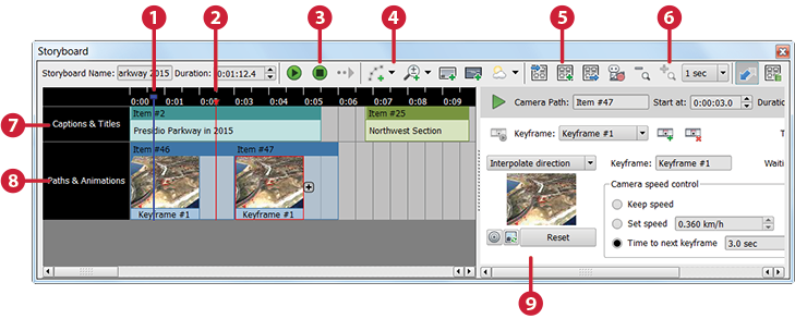 - Les commandes de lecture permettent de lire le story-board complet, en commençant par l'indicateur de début de lecture (ligne bleue). Chaque élément dispose de ses propres commandes de lecture.